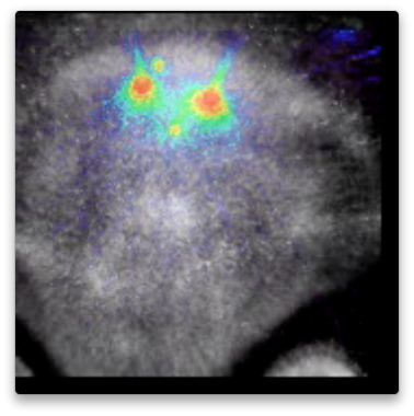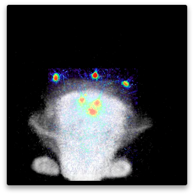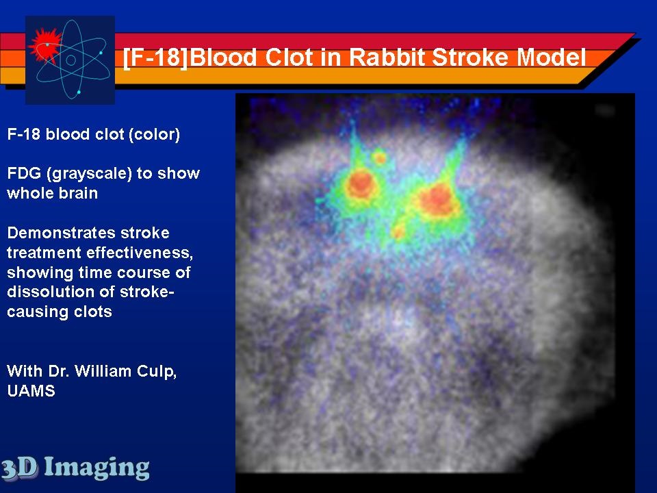 A natural stroke model in rabbits, in routine use in the laboratory Dr. Culp at UAMS, has been used for research into stroke progression and treatment. By addition of imaging to this model, the detailed progression of treatment of stroke has been measured. Clots formed from the rabbit’s blood were radiolabeled by 3D Imaging with F-18 (I-124 and Zr-89 labeling is equally possible, as well as labeling for SPECT with I-125 or I-123, or even fluorescent labeling; but the use of PET allowed quantitative measurement of clot dissipation during a two hour period including treatment.). The radiolabeled blood clots were used by Dr. Culp’s lab to create a natural stroke which was then treated. PET imaging before, during, and after treatment established that the clots were stable without treatment, degraded during treatment, and continued to degrade after treatment. These videos show the progression. In some only the PET scans are shown, so only the clots are visible, but are easily located and quantified. In others, an overlay of an FDG image is used to show the loacation of the brain and other soft tissues.
